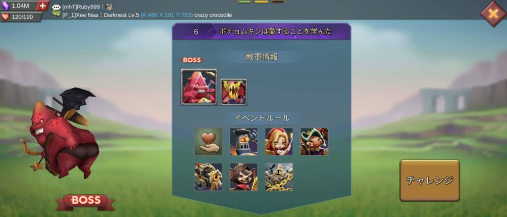 ロードモバイルの限定チャレンジ:ワタシハポチョムキン のステージ6(ポチョムキンは愛することを学んだ)のクリア方法を紹介します。全部のチャレンジをクリアしてポチョムキン(蒸気機兵)をゲットしましょう。