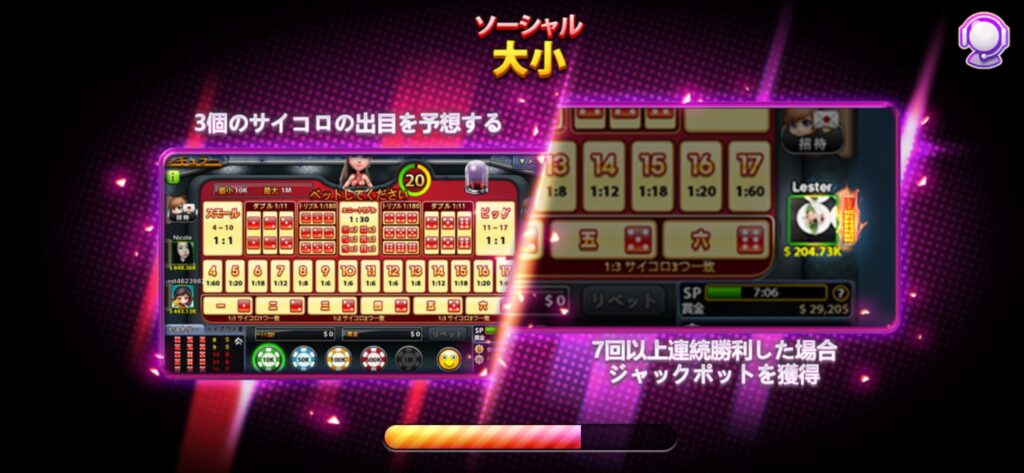 ただ、「3つとも同じ数字」が出てしまった場合、BETしたコインは没収となり、払い戻しはありません。そのため、100%ループし続けることができるわけではありません。が、高確率で「3つの合計が4-10」か「3つの合計が11ー17」が当たるため、コインが底をつくまで、続けることでプレイヤーレベルがガンガンあがります。