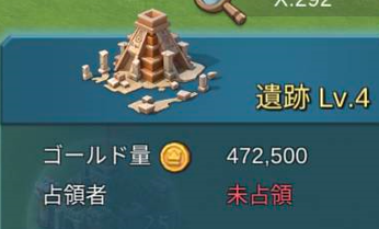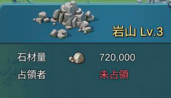 この場合、岩山Lv4には、石材量が、「858,975」あることがわかりますが、本来岩山Lv4は「1,260,000」獲得できるため、誰かが途中まで採取したポイントであることがわかります。