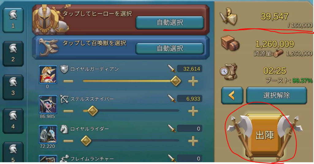 なお、右上に赤線を引いていますが、採取に出せる兵の数には上限があります。