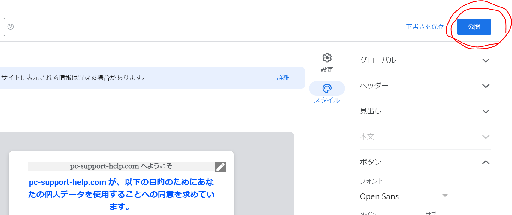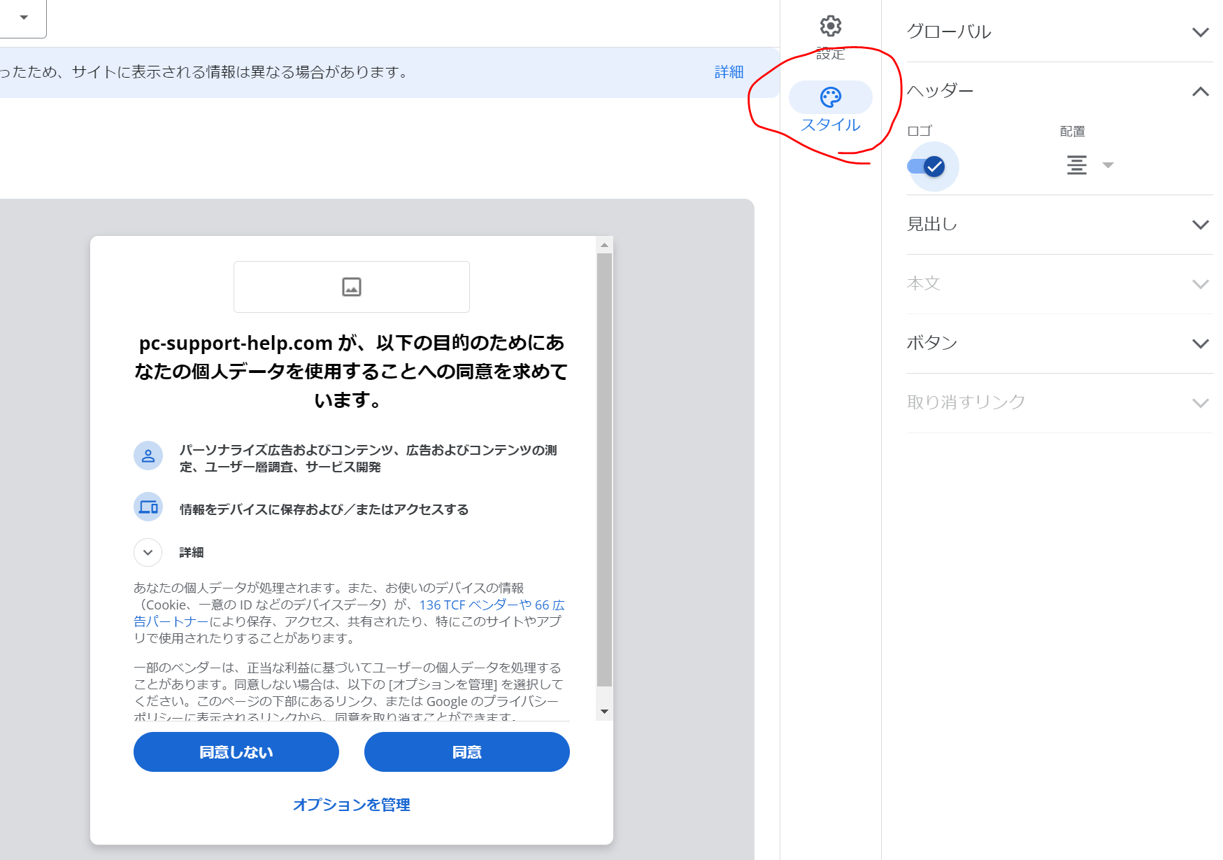 ・「同意しない」のボタンの色を変えたかったら[グローバル]内にある「サブ」の色を変更します。