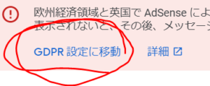 Googleアドセンスの管理画面にログインし、以下のような赤い枠内にある「GDPR設定に移動」をクリックします。
