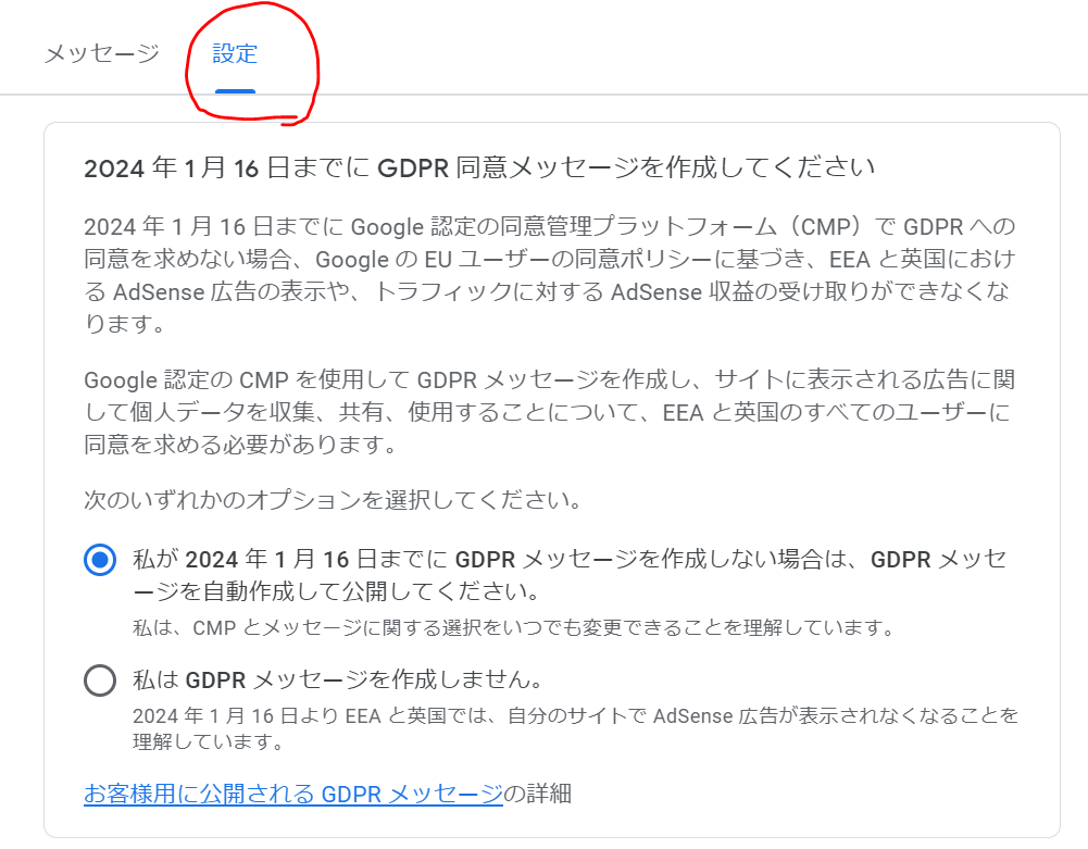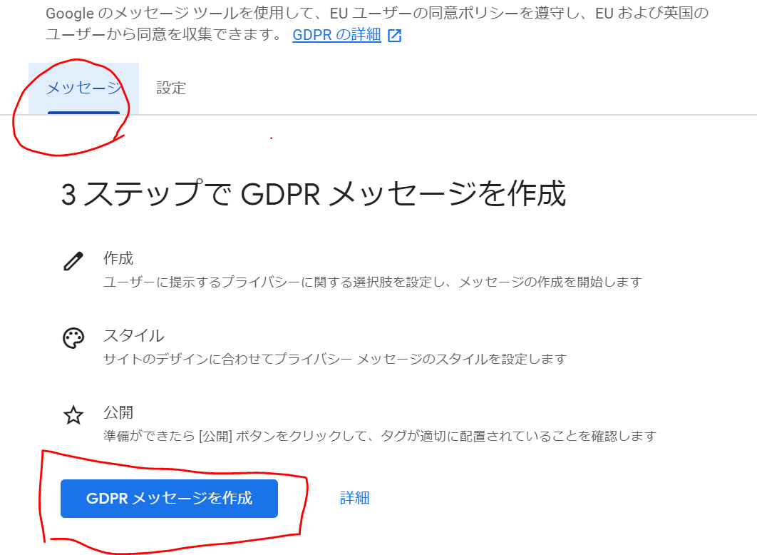 次に赤丸で囲んだ「メッセージ」タブを開いて、青く塗りつぶされている「GDPRメッセージを作成」をクリックします。
